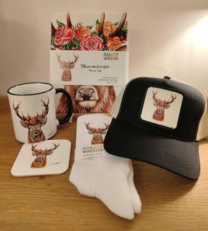 Tassen, Untersetzer, Geschirrtücher, Socken, Caps, Mützen